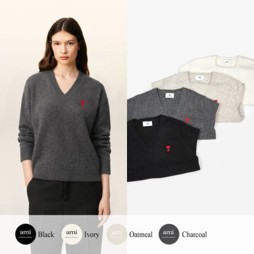 • AMI 아미 드 꾀흐 엠브로이더리 V넥 울 스웨터